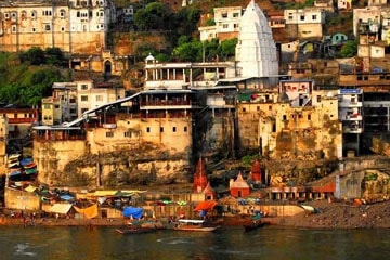 Omkareshwar is a Hindu temple dedicated to God Shiva. It is one of the 12 revered Jyotirlinga shrines of Shiva. It is on an island called Mandhata or Shivapuri in the Narmada river; the shape of the island is said to be like the Hindu ॐ symbol.